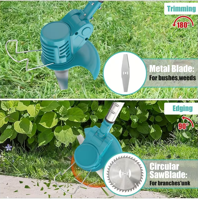 Aparador de Relva Sem Fios 21v | Aparador de Jardim com 2 x Baterias de 3Ah, Lâminas de Metal & 2 Lâminas de Serra Circular, Cabeça Rotativa de 90°, Lâminas de Substituição de Troca Rápida para Poda de Jardins, Relvados | Plástico, Bateria de Lítio Recarregável, 305mm a 762