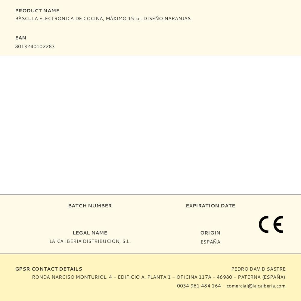 BALANÇA ELECTRÓNICA DE COZINHA, MÁXIMO 15 kg. DESIGN LARANJA. ECRÃ LCD 6,1 x 2,8 cm, MATERIAL DE VIDRO TEMPERADO 3 mm. TECLAS TOUCH SENSOR. BATERIA DE LÍTIO 2 x CR2032 3 V (INCLUÍDA). TEMPERATURA +10ºC +40ºC. HUMIDADE =85%. 22,3 x 18,4 x 1,7 cm