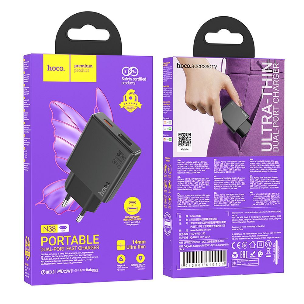 Carregador de celular Hoco Slim USB A + USB C QC3.0 PD 3A 20W N38 preto