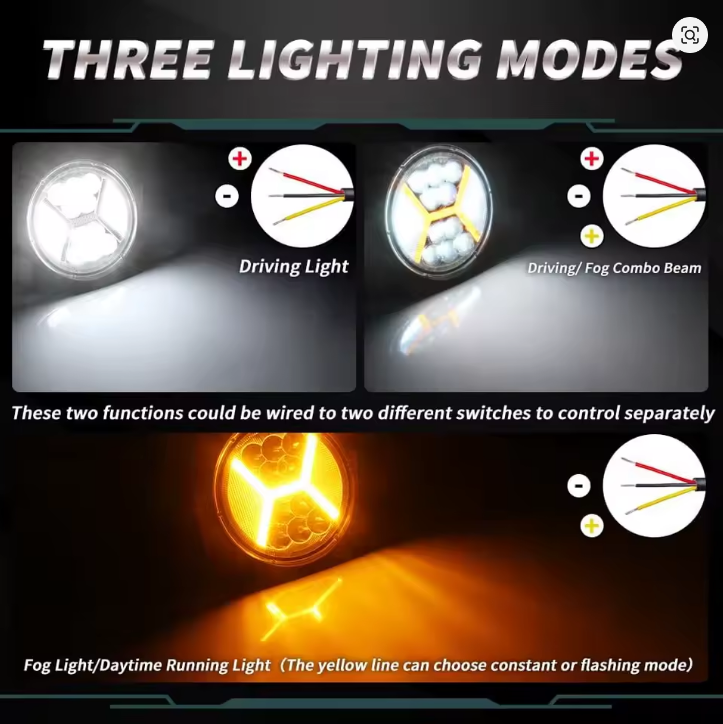Funções: DRL âmbar integrado + feixe combo (spot + flood)