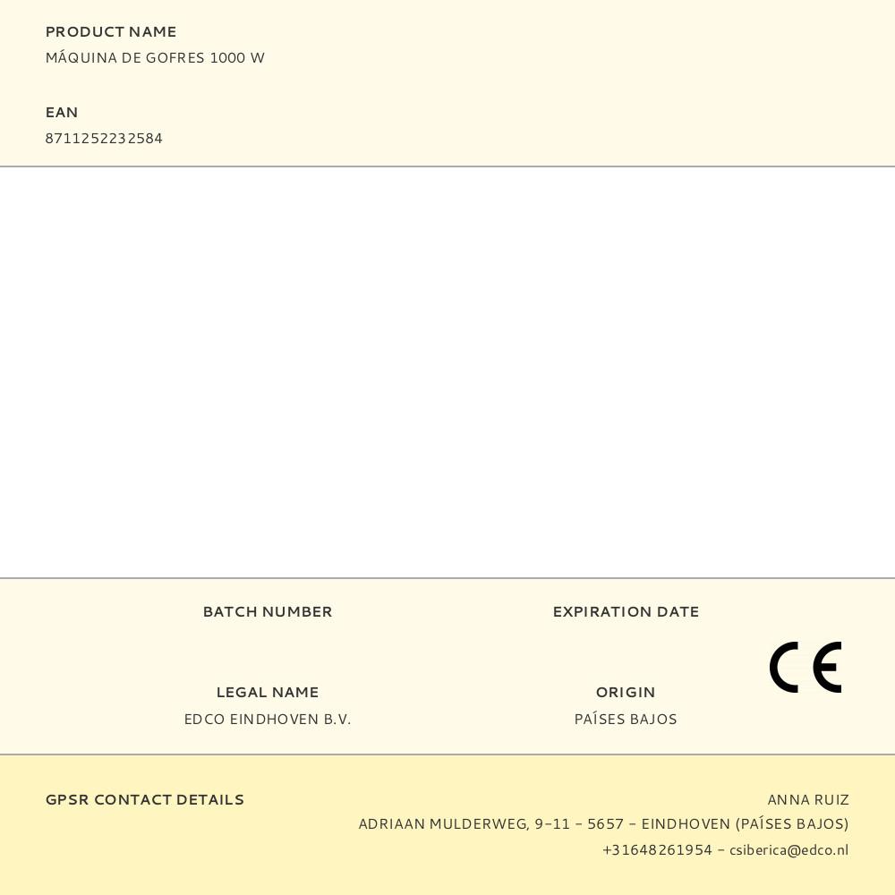 MÁQUINA DE WAFFLES 230V 1000W ALPINA