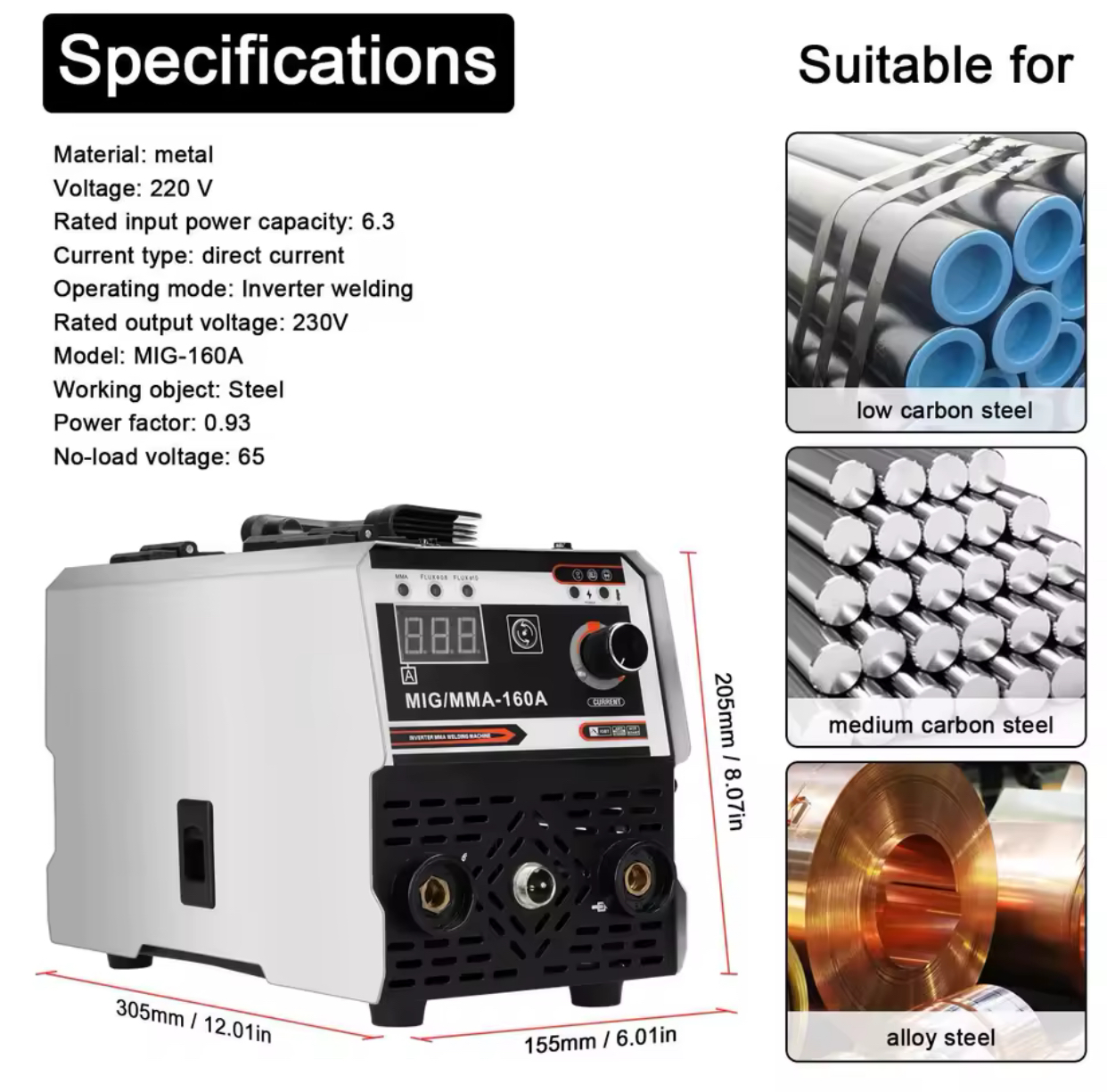 Equipada com tecnologia Inverter e funcionando em Corrente Contínua (DC), a MIG-160A garante um arco estável, soldagens mais limpas e menor espatter, proporcionando acabamentos de alta qualidade em diversos tipos de aço, incluindo aço de baixo e médio carbono e aço liga (alloy steel).