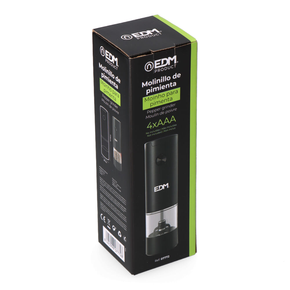 MOINHO DE PIMENTA ELÉTRICO 70 ml, 4 PILHAS AAA – 1,5V (NÃO INCLUÍDAS). BOTÃO ON/OFF, (PARA MOER, MANTENHA O BOTÃO PRESSIONADO), DEPÓSITO TRANSPARENTE E REMOVÍVEL, MOEDOR DE CERÂMICA. A LUZ LED LIGARÁ AUTOMATICAMENTE DURANTE A UTILIZAÇÃO. PODE AJUSTAR MANUALMENTE A ESPESSURA DO SOLO. APENAS PARA PIMENTA E SAL. Ø5,5 x 17,6 cm