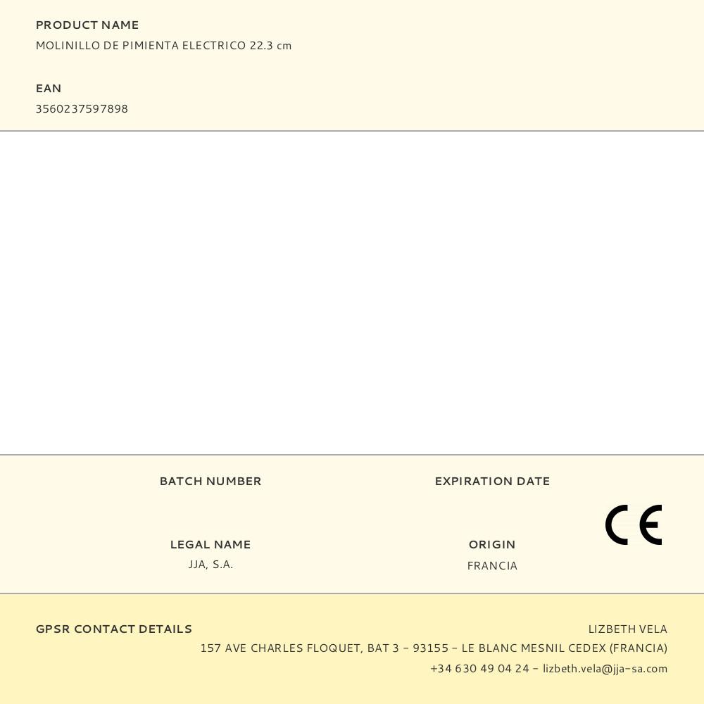 MOINHO PARA PIMENTA ELÉTRICO 22.3cm (altura) COLEÇÄO ‘NOIR KITCHEN’ FUNCIONA COM 4 PILHAS AA NÄO INCLUIDAS.