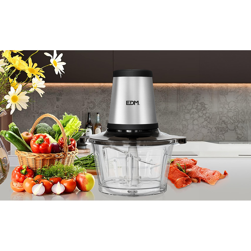 PICADORA 350 W, 1,8 l, APTA PARA TODOS OS TIPOS DE ALIMENTOS, PICA E CORTA. DUAS VELOCIDADES ATRAVÉS DE BOTÃO. 4 LÂMINAS REMOVÍVEIS DE AÇO INOXIDÁVEL. COPO LIQUIDIFICADOR DE VIDRO 1.8 l. ACOPLADOR DE METAL PARA UMA VIDA ÚTIL DURADOURA. CARCAÇA DE AÇO INOXIDÁVEL. BASE ANTIDERRAPANTE