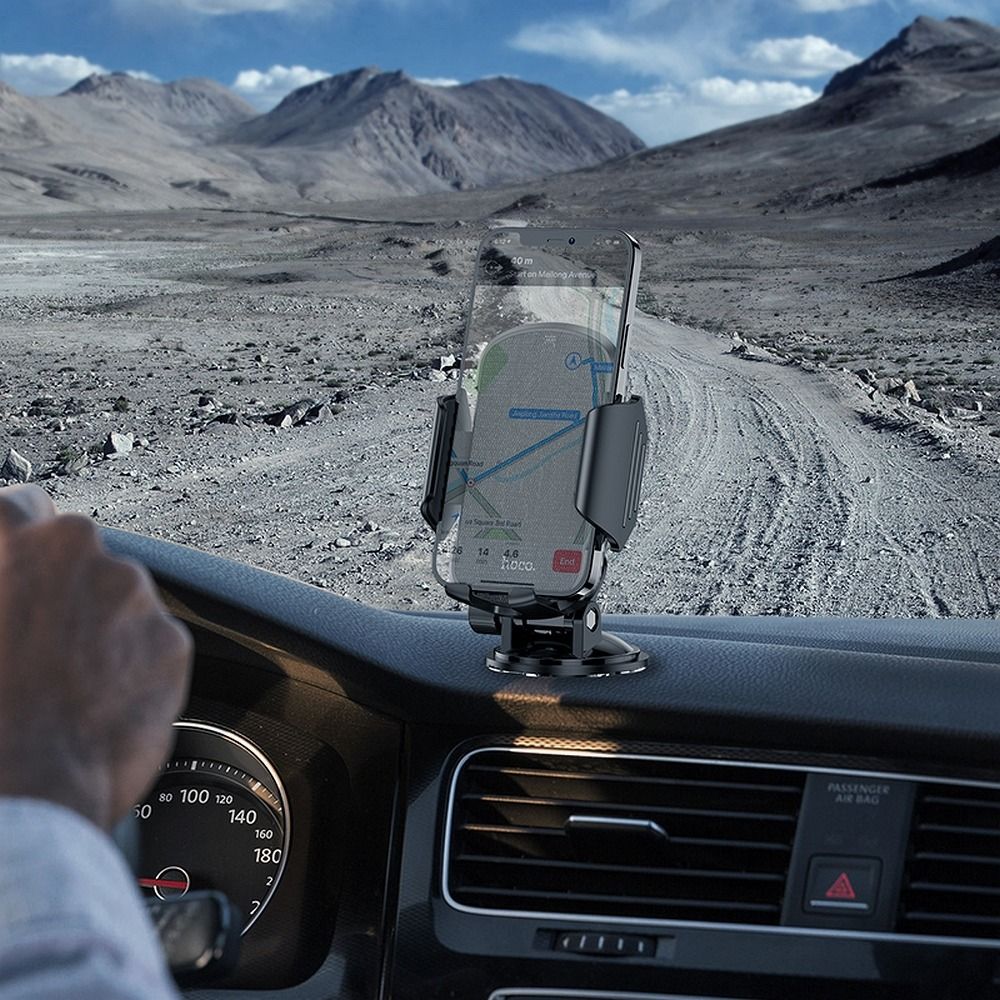 Suporte universal para carro com ventosa de alta resistência. Projetado para fixação no painel ou no para-brisa.